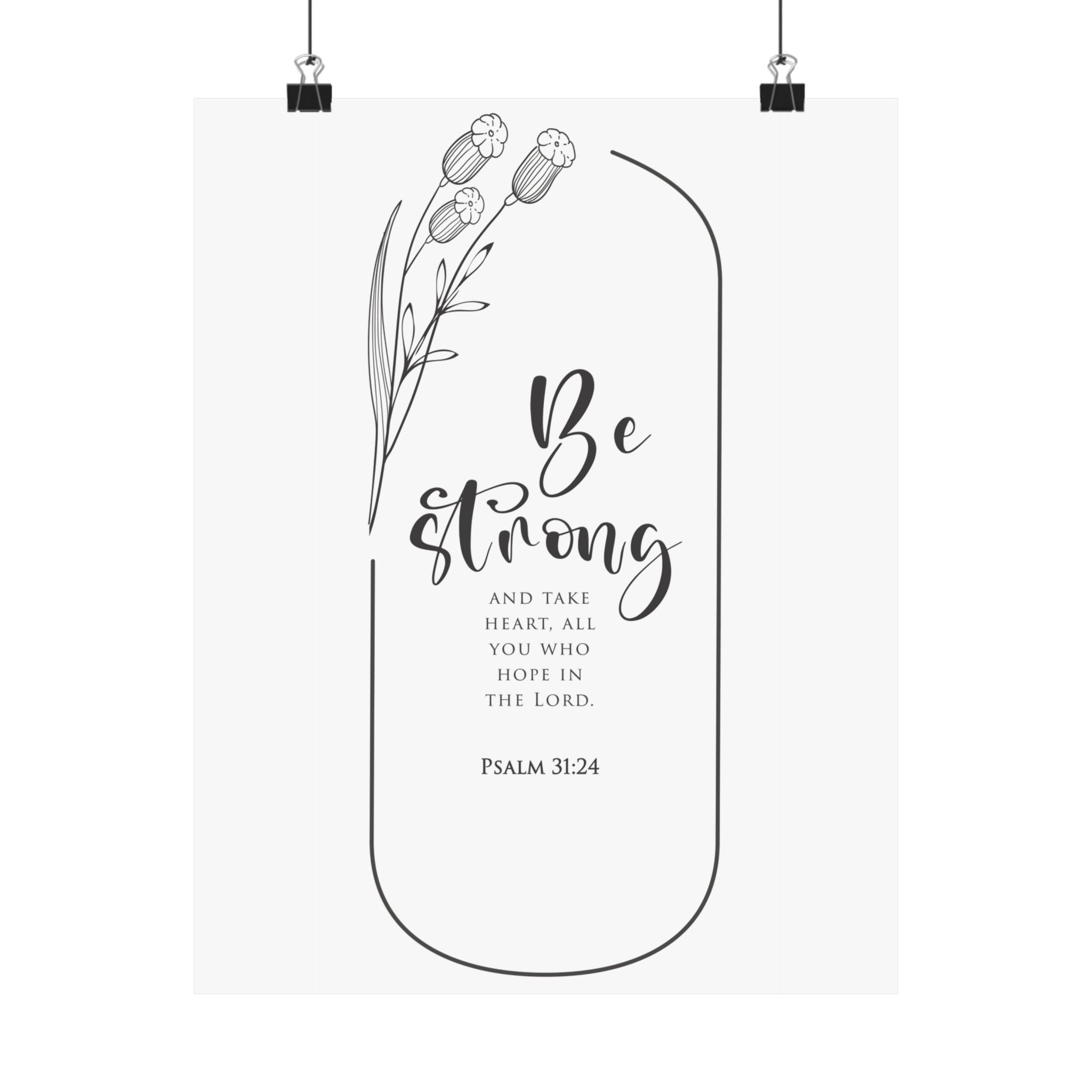 Bold and motivating, this matte vertical poster features Psalm 31:24: “Be strong and take heart, all you who hope in the Lord.” The clean black and white typography with simple botanical accents makes a strong statement for offices, classrooms, entryways, and prayer corners. A meaningful gift for graduates, new jobs, leadership seasons, and anyone who needs courage rooted in faith. Museum grade paper and giclée printing keep the details crisp and rich, while the matte finish stays soft and glare free. Available in 8 sizes.
