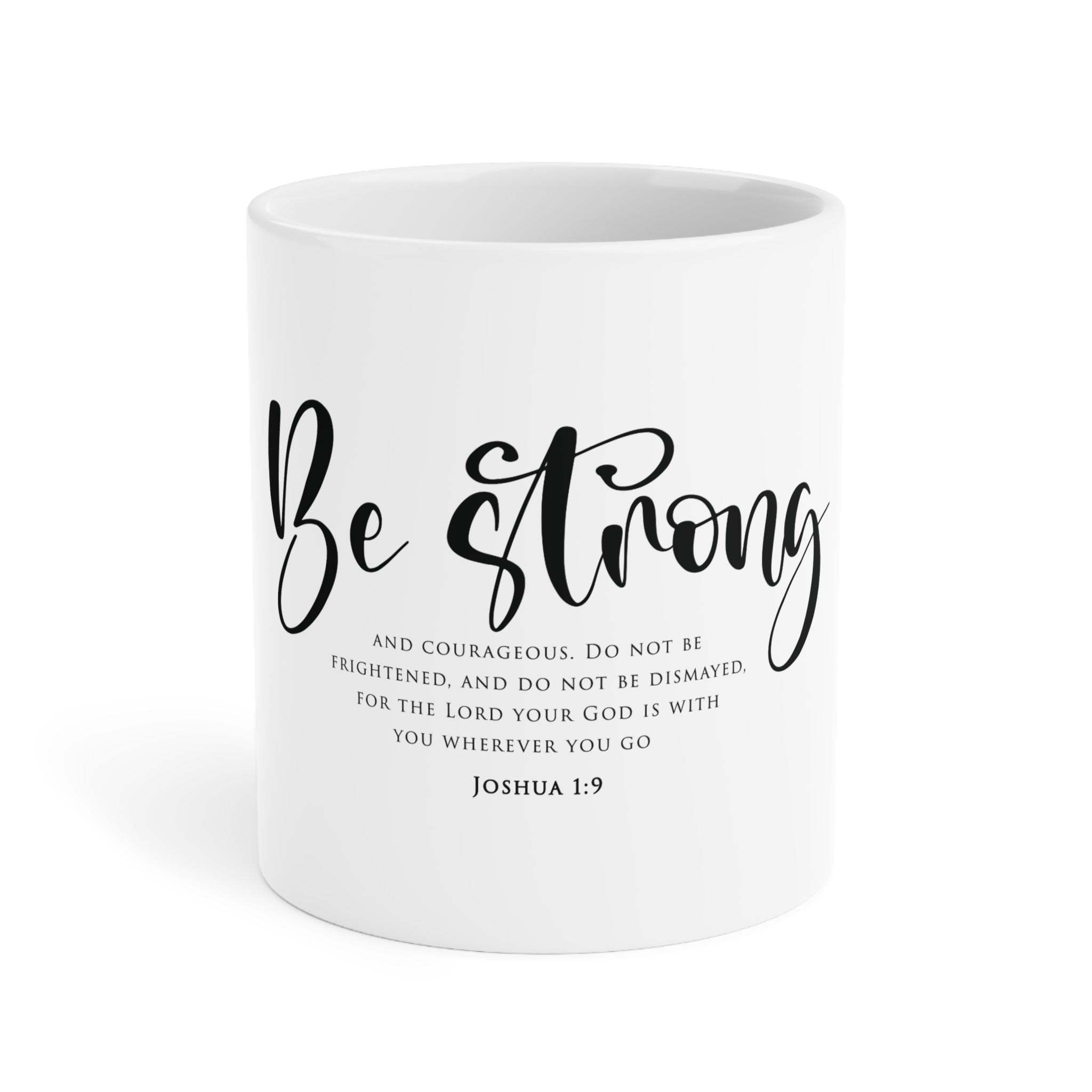 A crisp white ceramic mug featuring Joshua 1:9 in bold black lettering. “Be strong” is written larger and with confident flow, while the verse beneath it anchors the message with courage and presence: God is with you wherever you go. It’s the kind of mug that feels like a pep talk and a prayer at the same time.
