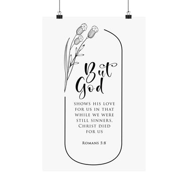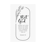 Bold and deeply meaningful, this matte vertical poster features “But God” in oversized script typography, paired with Romans 5:8: “But God shows his love for us in that while we were still sinners, Christ died for us.” The arched frame and botanical accents feel modern, reverent, and easy to style.