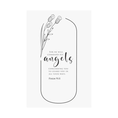 Protective and reassuring, this matte vertical poster features Psalm 91:11: “For He will command His angels concerning you to guard you in all your ways.” The airy black and white design with simple floral accents is perfect for entryways, bedrooms, nurseries, and prayer corners. A meaningful gift for new seasons, travel, moving, and anyone who needs comfort in God’s protection. Museum grade paper and giclée printing preserve crisp lines and deep blacks, with a matte finish that reduces glare for a soft, modern look. Available in 8 sizes.