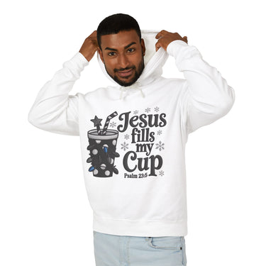 Faith Culture - Jesus Fills My Cup Unisex Christian Hoodie – White | Psalm 23:5 Cozy Faith Sweatshirt
