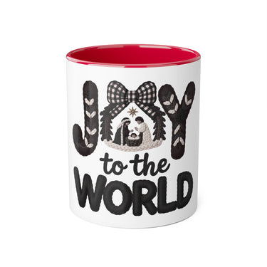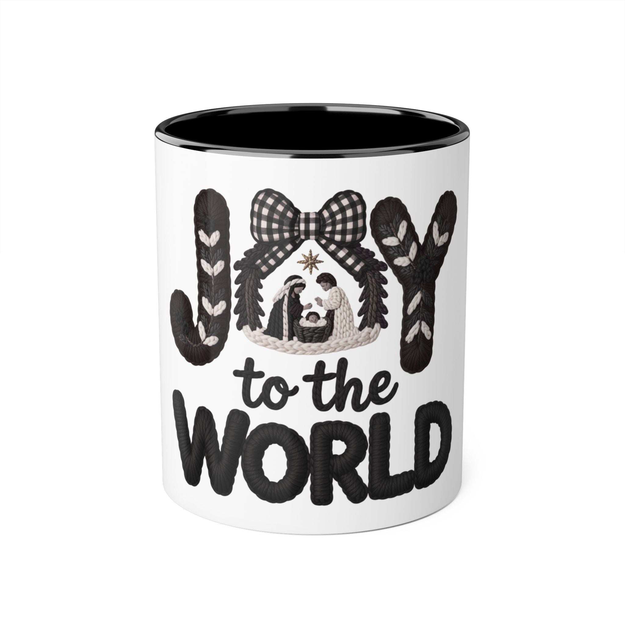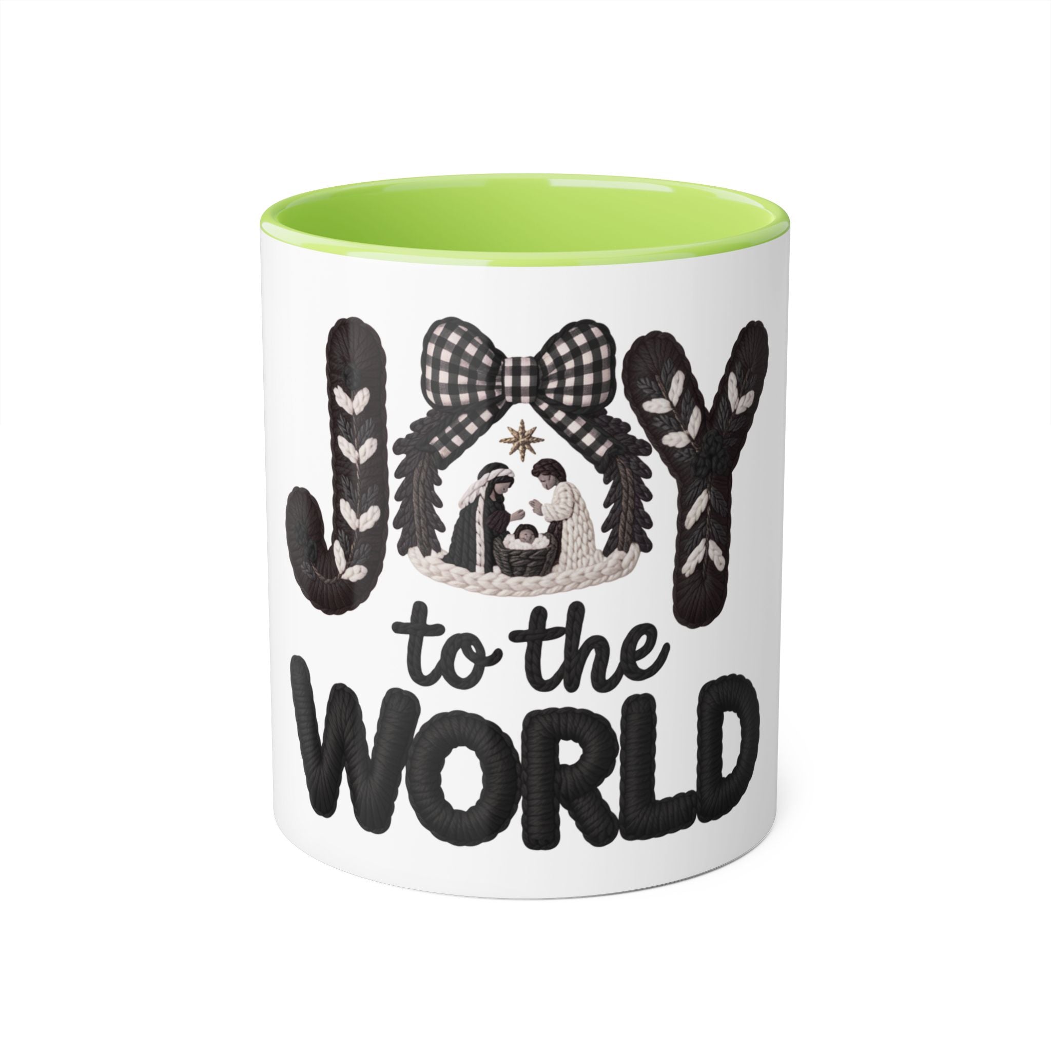 Let your everyday coffee moments echo the angels’ song. Our Joy to the World Manger Knit Christian Christmas Mug showcases “JOY” in cozy knit letters, wrapped with branches and ribbon, with a sweet manger scene beneath a gingham bow. “to the WORLD” in bold knit style lettering anchors the message of hope and salvation.