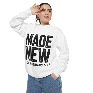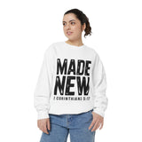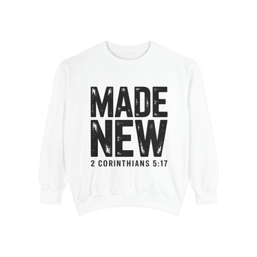 Faith Culture Made New Garment Dyed Crewneck Sweatshirt – White | 2 Corinthians 5:17 Christian Sweatshirt