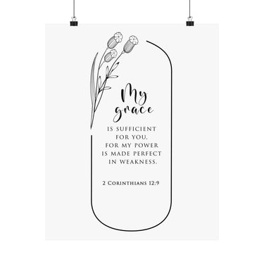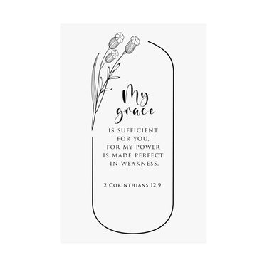 Gentle strength for hard days, this matte vertical poster features “My grace is sufficient for you, for my power is made perfect in weakness” paired with 2 Corinthians 12:9. The black and white minimalist design with floral line art keeps the message clear, comforting, and easy to style.