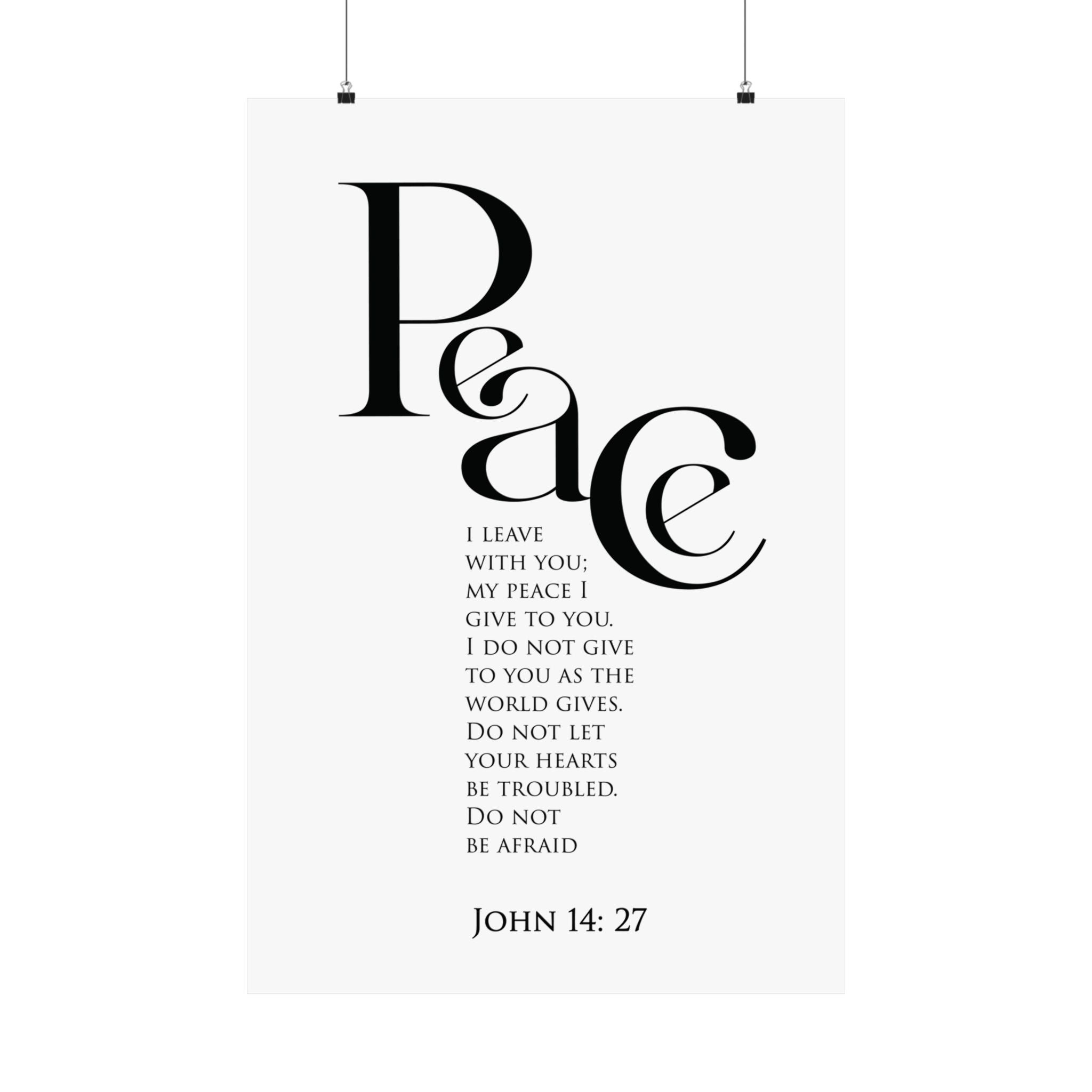 Calm and grounding, this matte vertical poster features “Peace” in bold modern typography with the promise of John 14:27. The clean black and white layout feels soothing and uncluttered, creating a quiet moment of peace in any room.