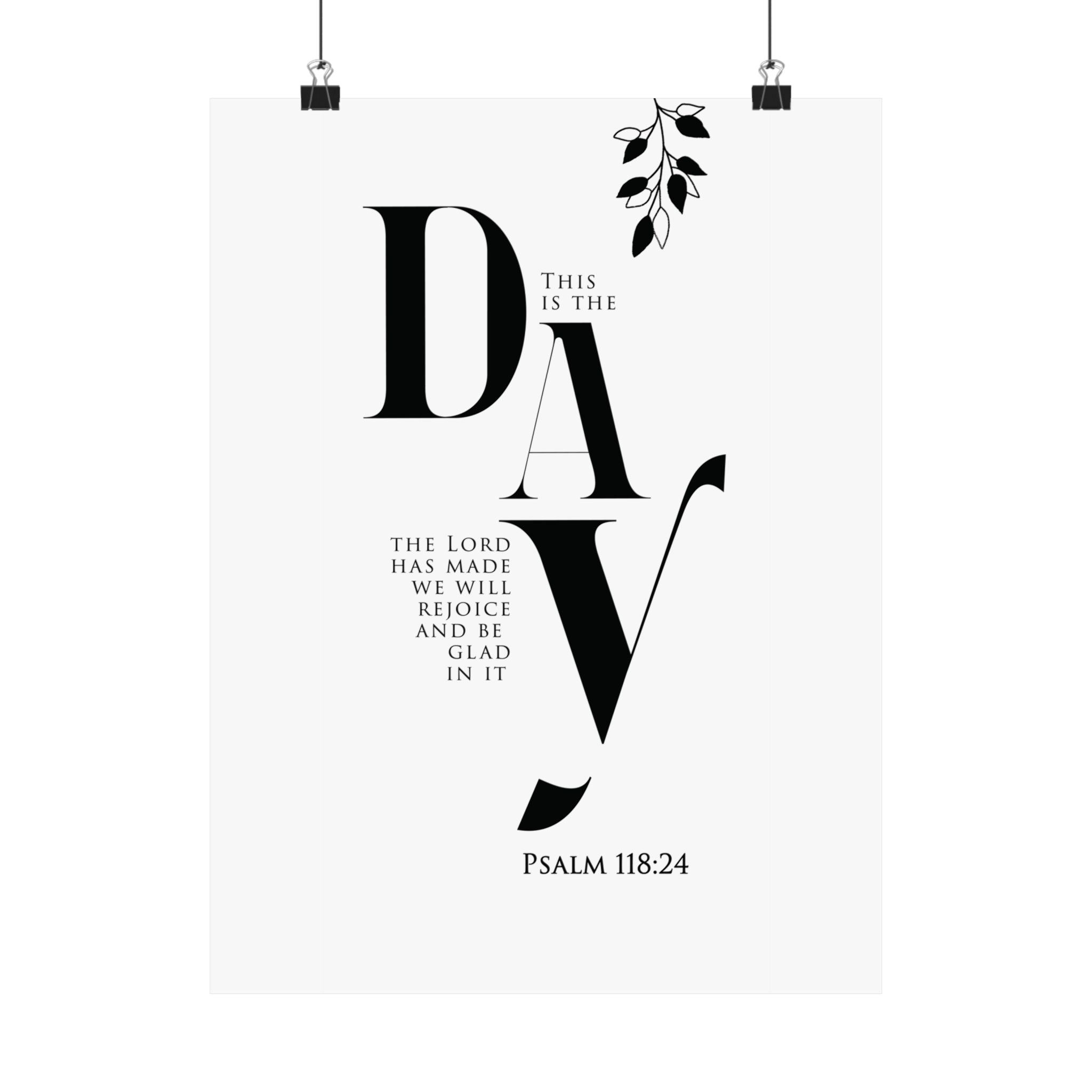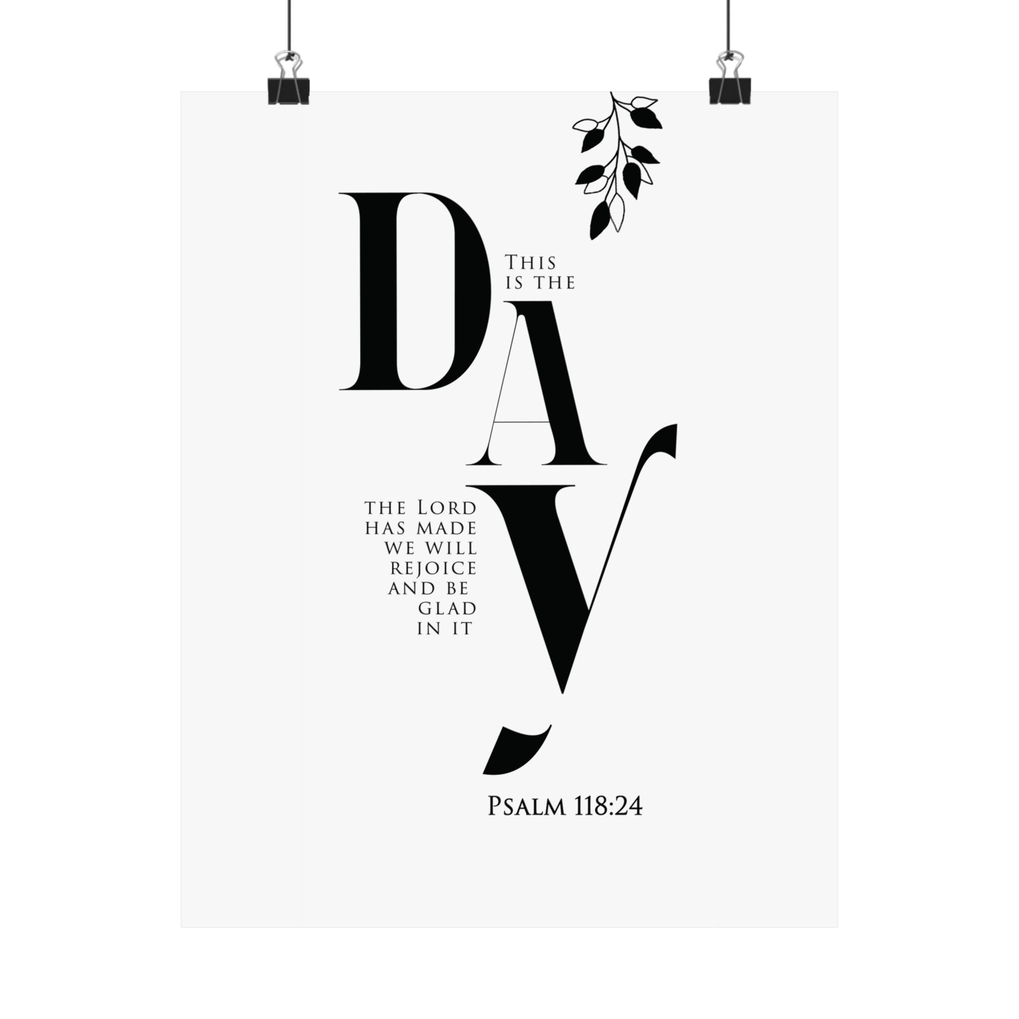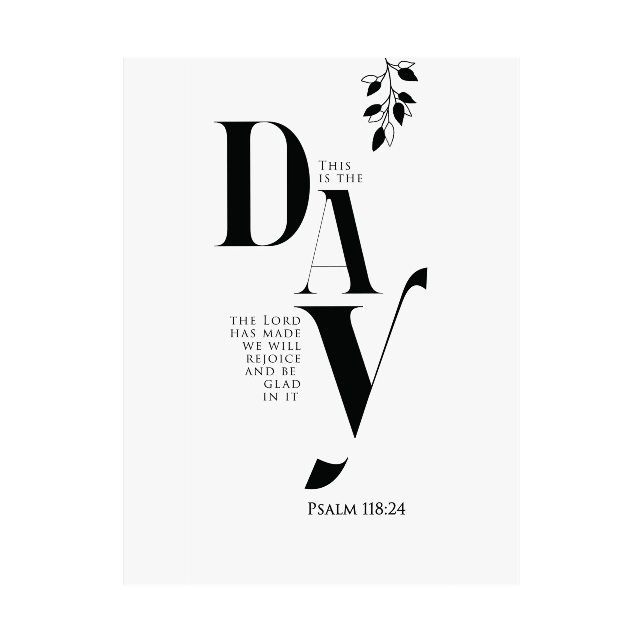Bright and uplifting, this matte vertical poster features “This is the day the Lord has made; we will rejoice and be glad in it,” paired with Psalm 118:24. The minimalist black and white typography with a simple botanical accent brings a fresh, joyful tone to kitchens, entryways, dining spaces, and morning routines. A meaningful gift for housewarmings, weddings, new seasons, or anyone who wants to start each day with gratitude and praise. Museum grade paper and giclée printing keep the text crisp and the blacks rich, while the matte finish stays soft and glare free. Available in 8 sizes for easy styling.