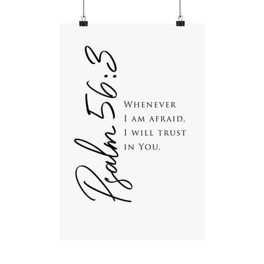Gentle and faith anchoring, this matte vertical poster features Psalm 56:3: “Whenever I am afraid, I will trust in You.” The clean black and white typography with modern script details creates a calming statement for bedrooms, living rooms, offices, and prayer corners. A meaningful gift for anxious seasons, new transitions, and anyone learning to choose trust over fear. Museum grade paper and giclée printing keep the details crisp and rich, while the matte finish stays soft and glare free. Available in 8 sizes.