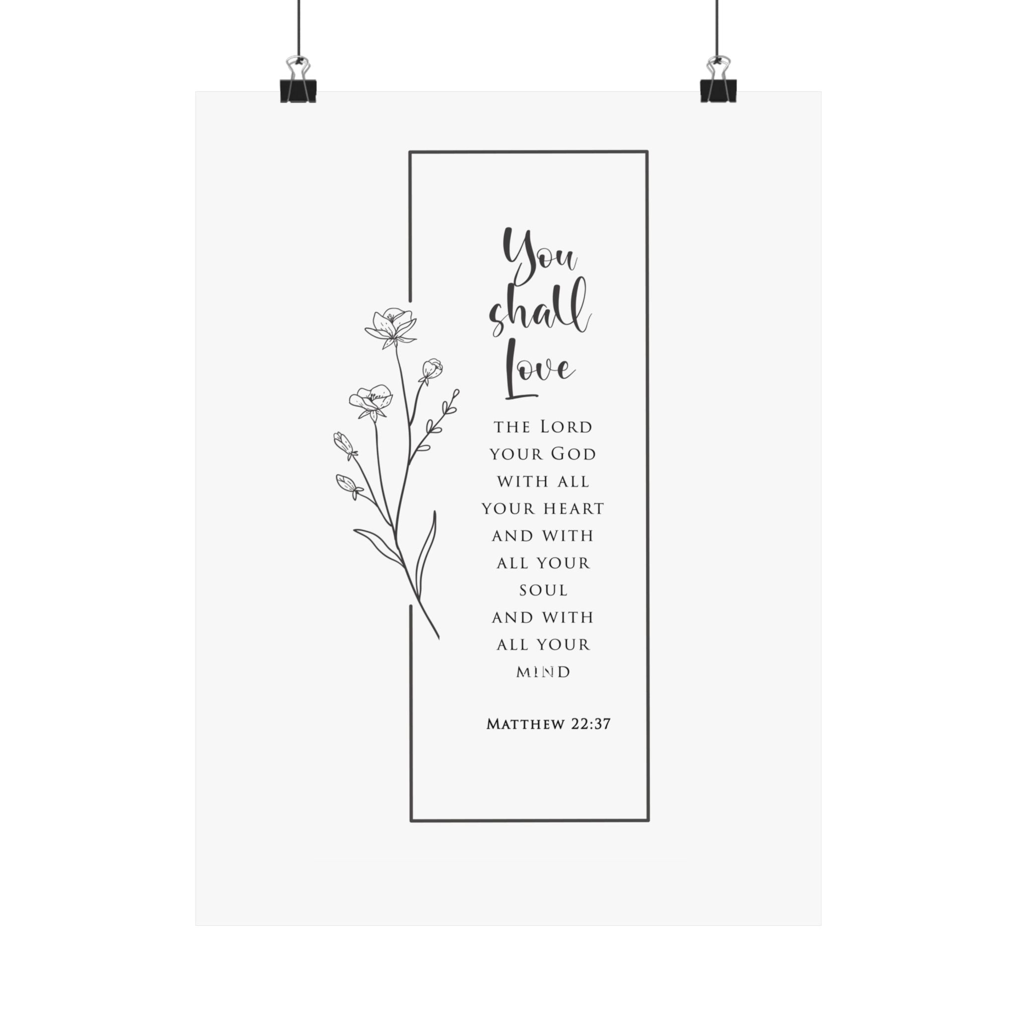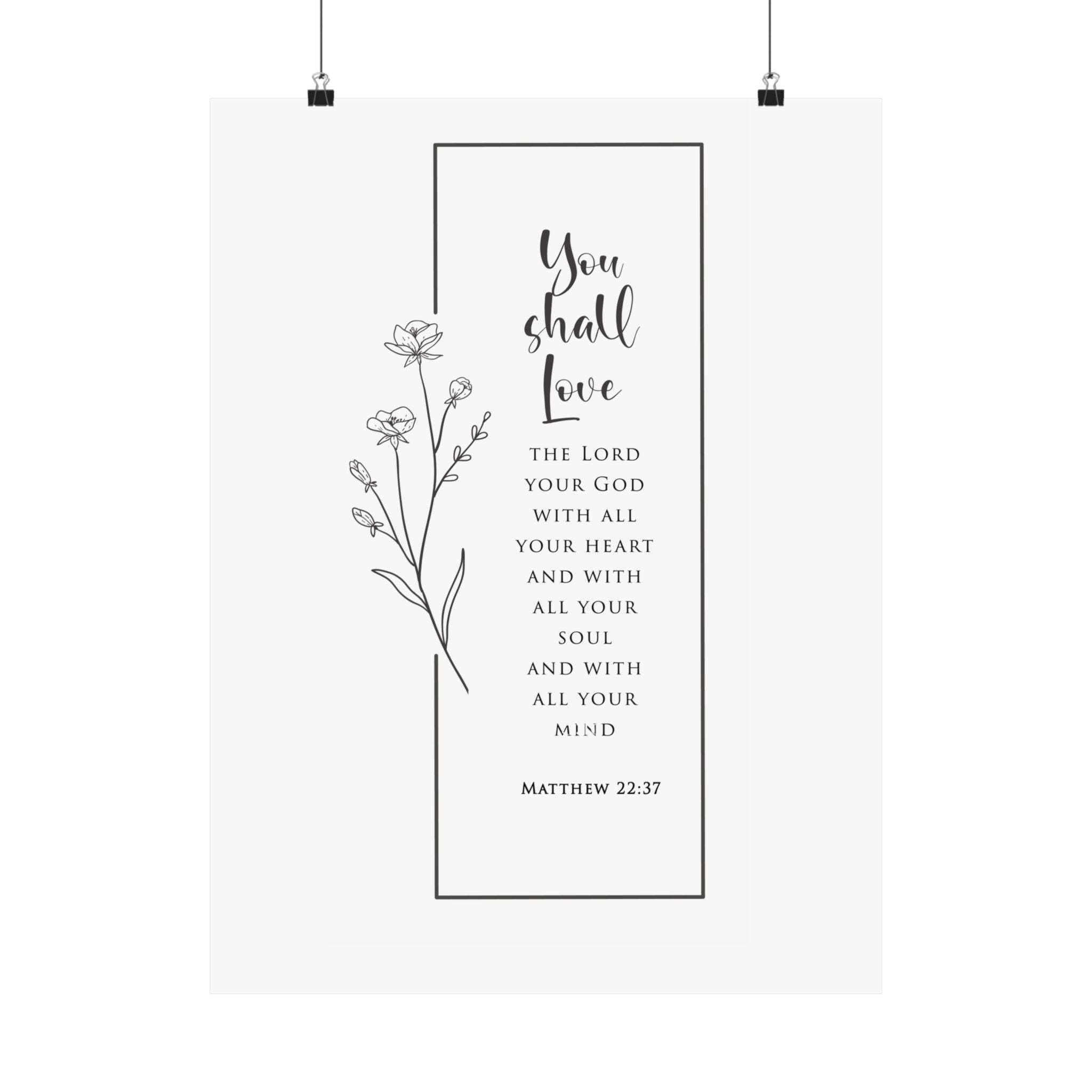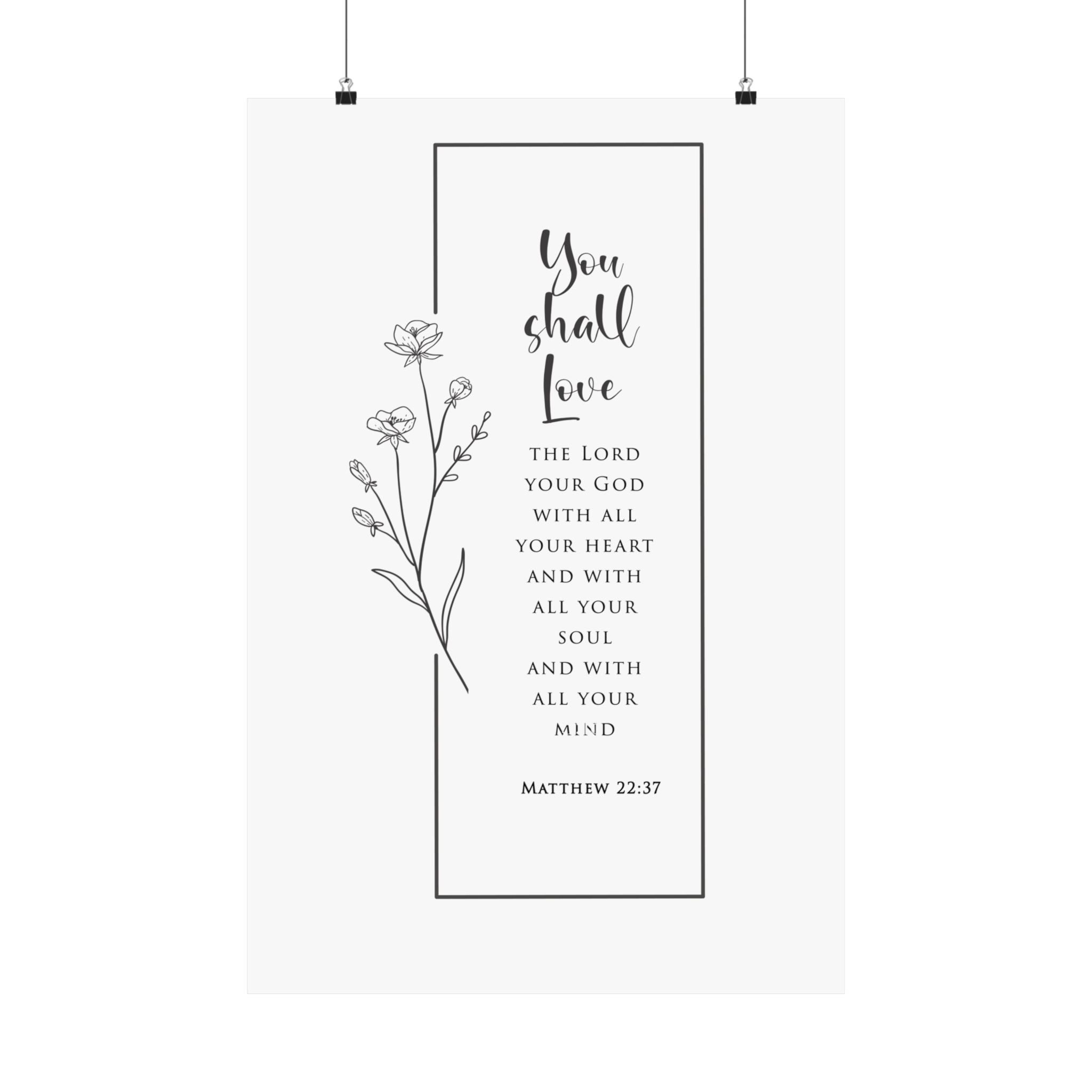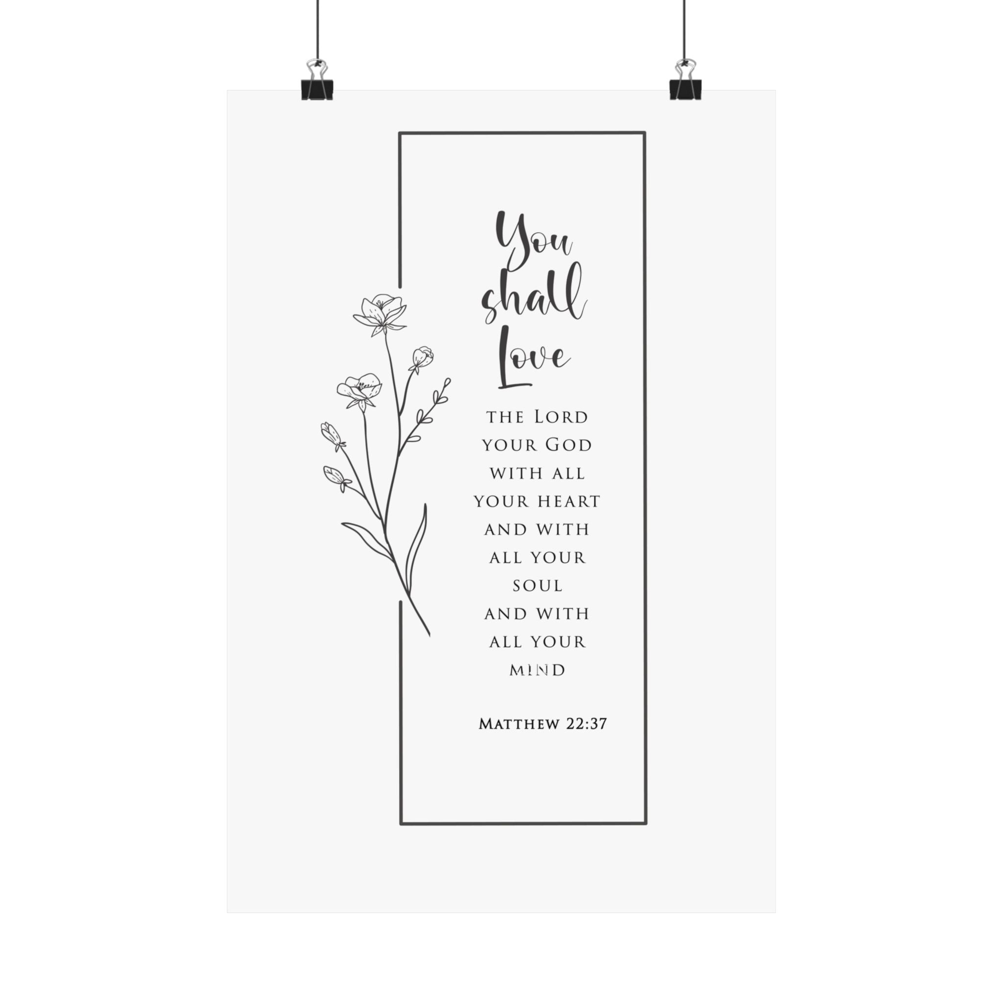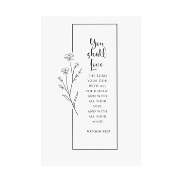 Reverent and timeless, this matte vertical poster features “You shall love the Lord your God with all your heart and with all your soul and with all your mind” paired with Matthew 22:37. The clean black and white layout with delicate floral line art makes a beautiful statement without overwhelming your space.